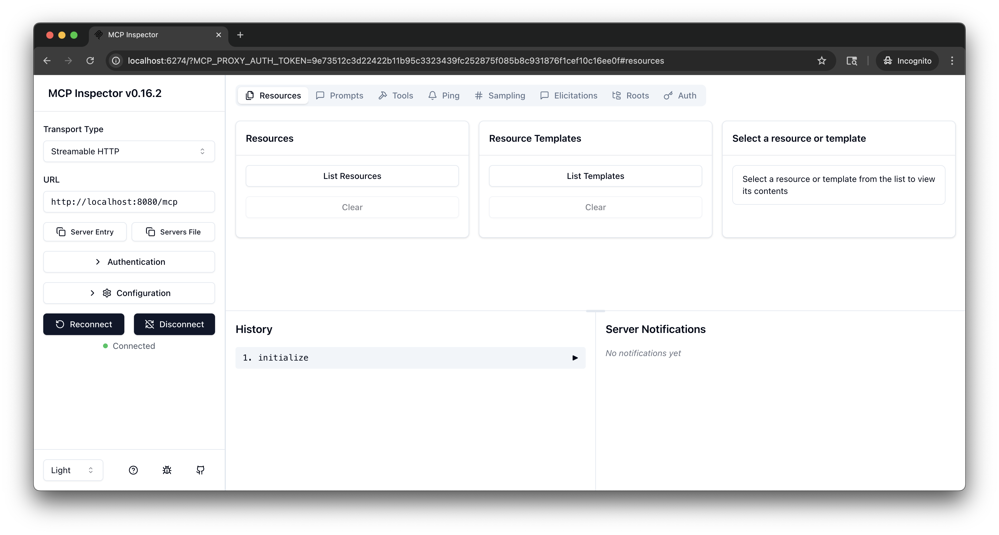 From the terminal, run the MCP Inspector command. Then, the MCP Inspector opens in your browser. If the MCP inspector tool does not open automatically, run